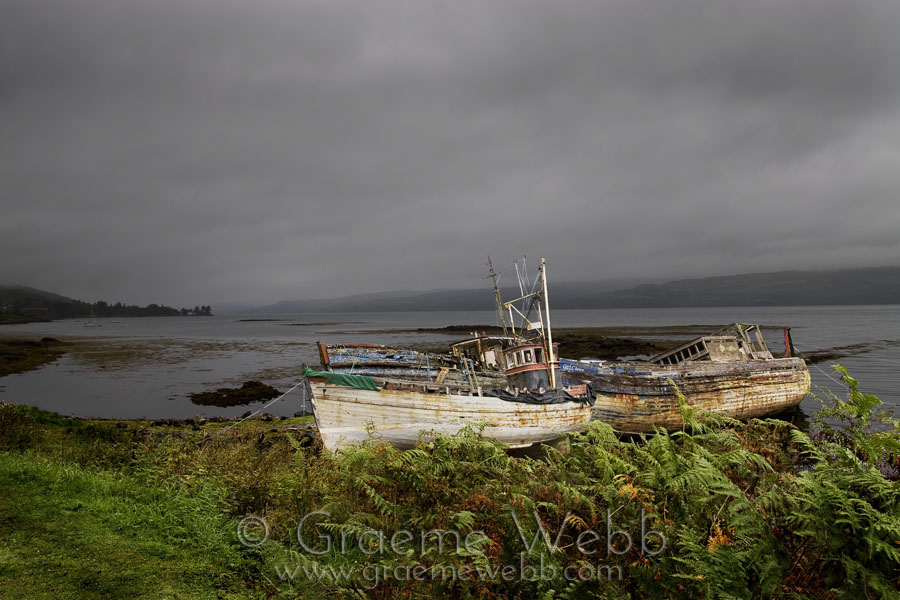 More of the Isle of Mulls abandoned boats, this time just outside the lovely village of Salen. This image was taken in late 2007, and on my visit there, late 2010, it is sad but inevitable to see that they have deteriorated at great speed. The wheelhouse of the rear boat has fallen through the deck, and they all now lean over dramatically.